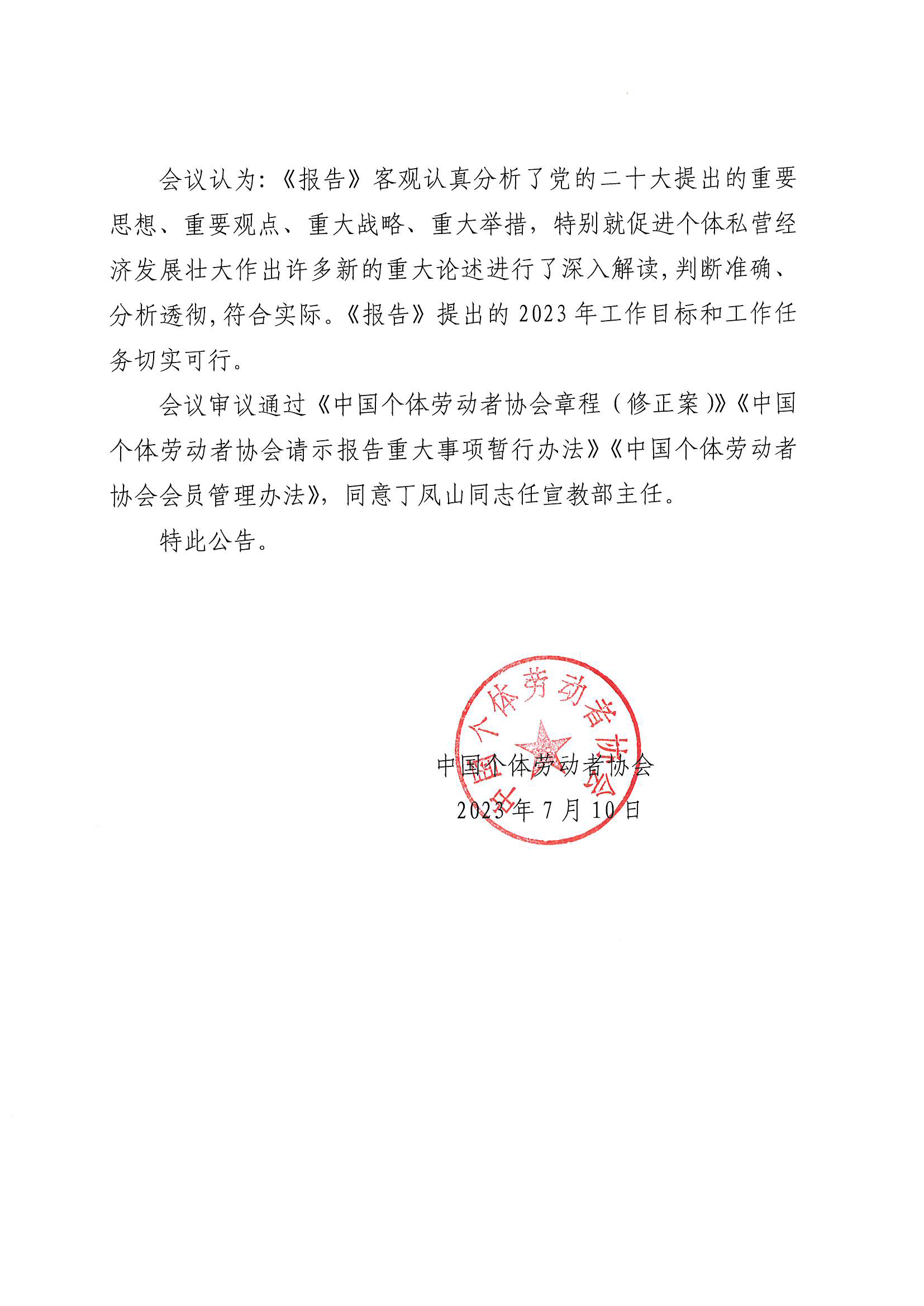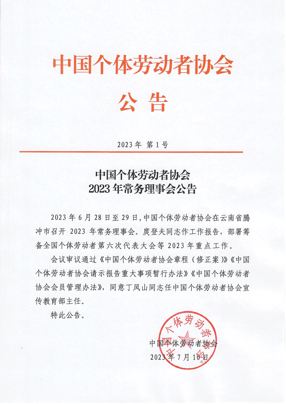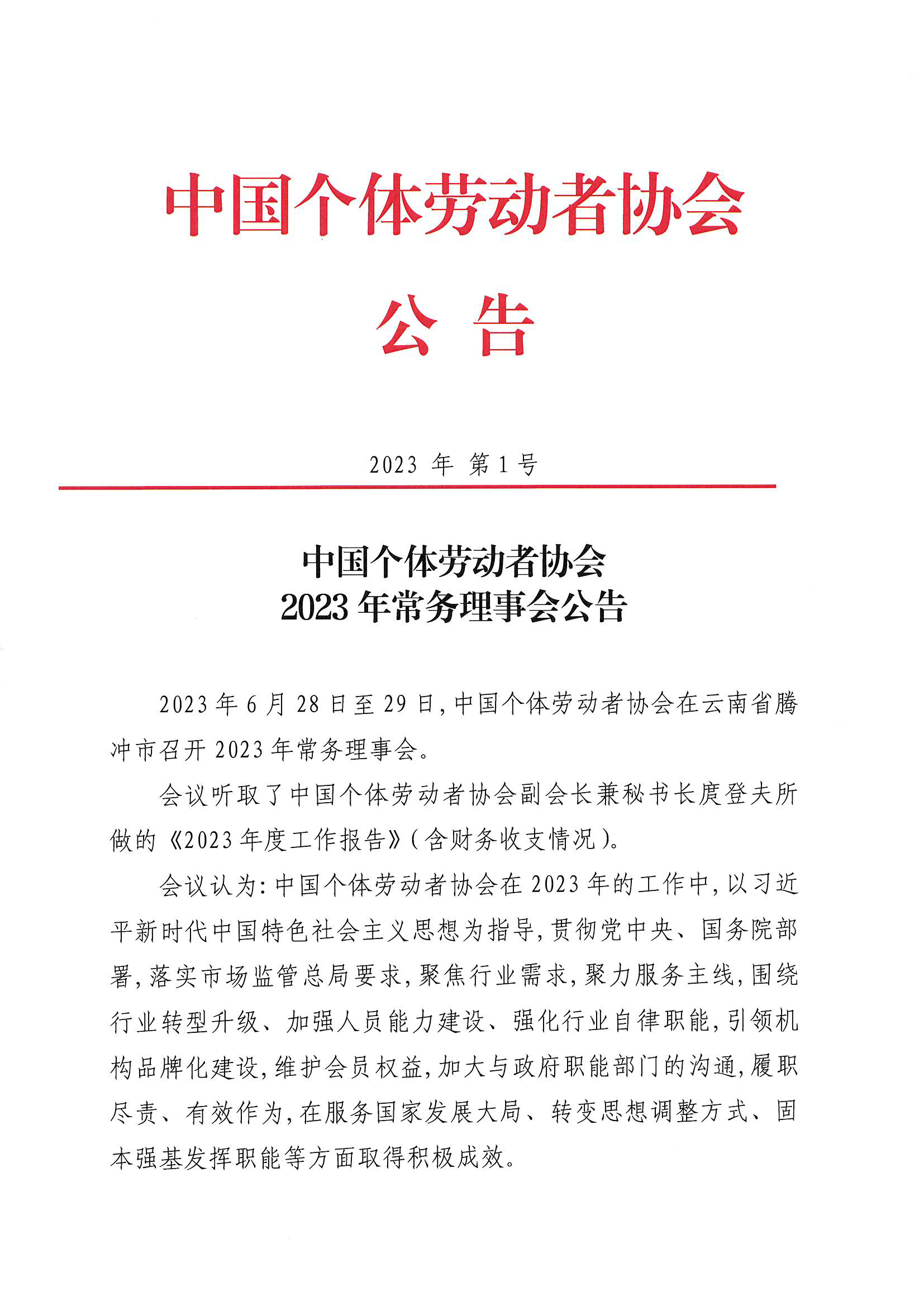 中国个体劳动者协会2023年常务理事会公告